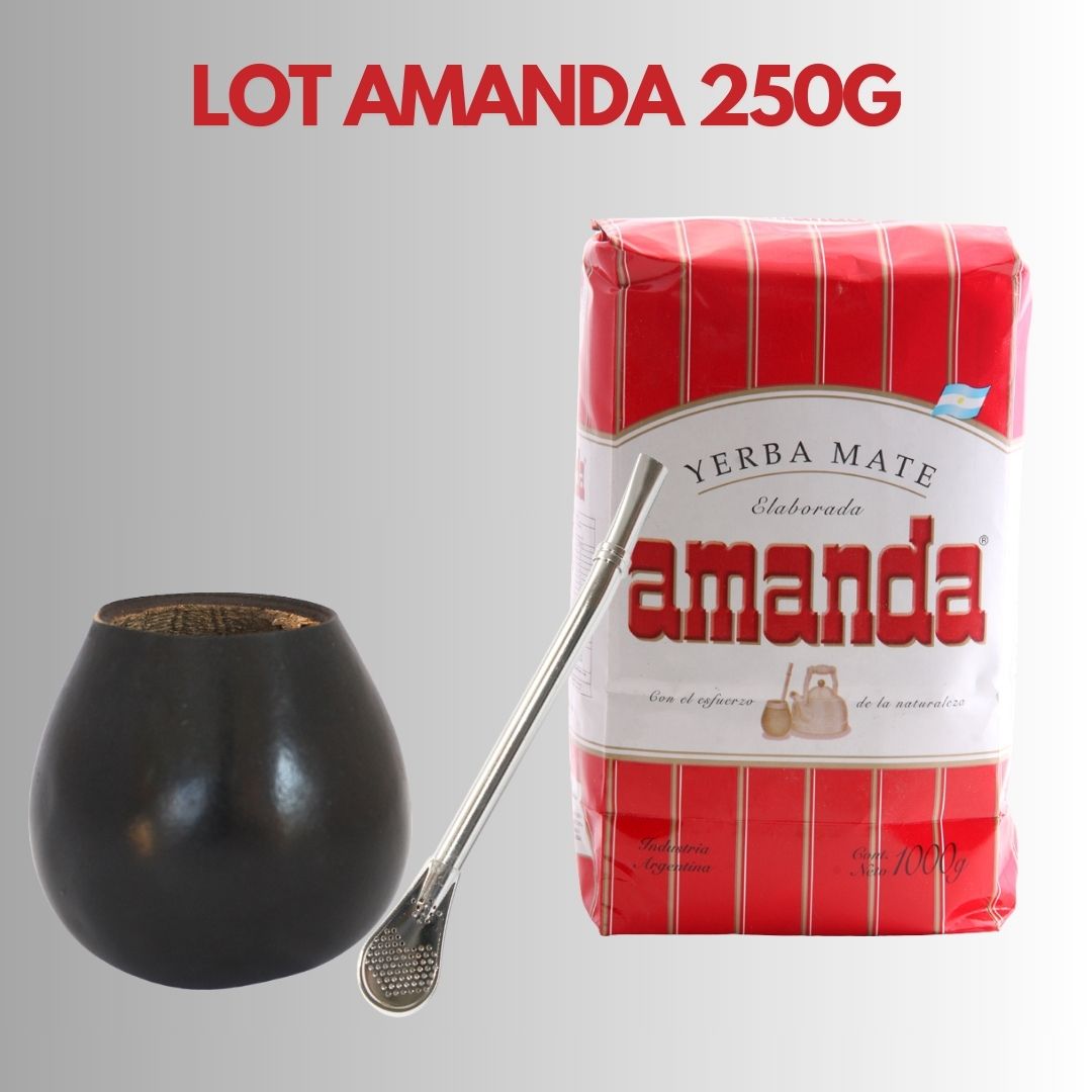 Découvrez et profitez de tous les bienfaits du maté grâce à ce lot qui associé un paquet de Yerba Maté Amanda, une bombilla boule, et une calebasse de couleur noire.